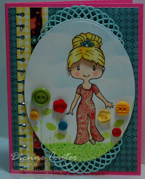 I made an easel card . I chose the cute Gilli Florist. Gilli was colored with watercolor pencils and a bit of water. I used a variety of punches for added décor. The flowers were embossed to have a more natural look. For added touch ribbons and buttons.